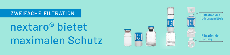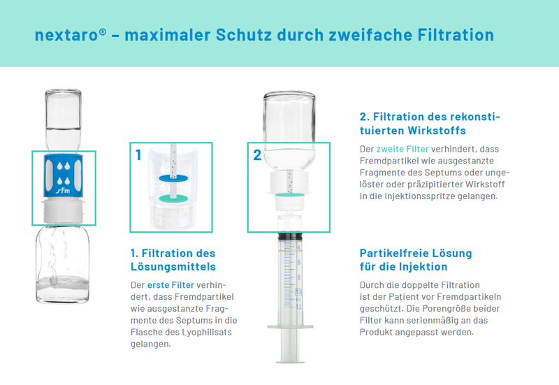 Bei der Rekonstitution lyophilisierter Arzneimittel besteht die Möglichkeit, dass beim Durchstechen des Septums eines Vials kleinste Partikel ausgestanzt werden.1 Diese könnten bei der Applikation des Arzneimittels in den Körper gelangen. Der Premium-Adapter nextaro® minimiert dieses Risiko mit seinem durchdachten Filtersystem.