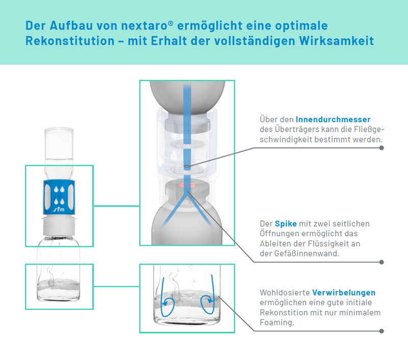 Schaumbildung ist eine der großen Herausforderungen bei der Rekonstitution von pharmazeutischen Lyophilisaten - und sollte verhindert werden. Denn Schaum kann die Wirksamkeit des Produktes beeinträchtigen und die Verabreichung verzögern. Der Premium-Adapter nextaro® beugt dem „Foaming“ mit seinem einzigartigen Aufbau vor.