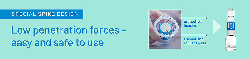 Depending on the transfer system, cannulas or spikes penetrate the septum of the vials during reconstitution. Whether this process succeeds without difficulty depends on the properties of the septum and especially on the configuration of the cannulas/spikes. The spikes of the nextaro® premium transfer system are designed so that insertion requires only little force.