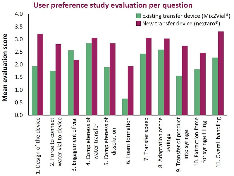 Octapharma, one of the world’s leading pharmaceutical companies specializing in the development, production, and distribution of drugs for treating various blood coagulation disorders, conducted a comparative study. The aim was to compare the user-friendliness and design of nextaro® with the existing Mix2Vial system. Both systems were evaluated for the reconstitution of coagulation factor products, among others, a four-Factor Prothrombin Complex Concentrate (Octaplex®/Balfaxar®). With positive results! The study revealed a 40% higher preference among users for the new nextaro® compared to the previous transfer system. The following factors were specifically compared: